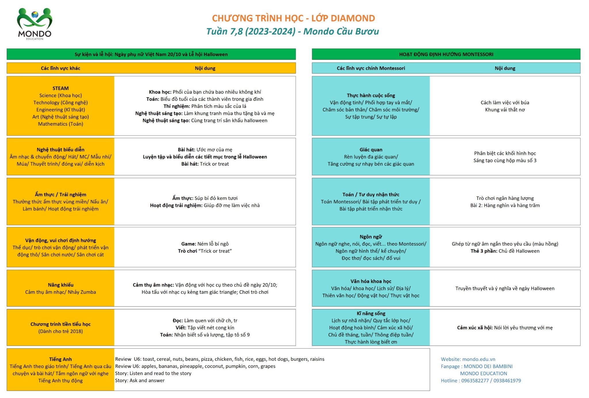 Được xây dựng bởi những chuyên gia hàng đầu về phương pháp Montessori, Mondo Dei Bambini tự hào mang đến chương trình học hiện đại, được thiết kế chủ đạo theo phương pháp Montessori nguyên bản, phát huy tối đa 6 lĩnh vực: Thực hành cuộc sống, Giác quan, Ngôn ngữ, Văn hóa khoa học, Âm nhạc chuyển động, được kết hợp hài hòa cùng các hoạt động STEAM, nghệ thuật sáng tạo, biểu diễn … giúp bé ĐỘC LẬP – TỰ TIN – SÁNG TẠO hướng tới công dân toàn diện tương lai